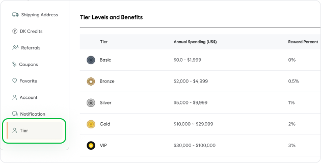 As a tier member, you earn DK Credits on international shipping and warehouse service payments, except for storage fees and eWallet top-ups. Higher tiers—Bronze, Silver, Gold, and VIP—earn more rewards.